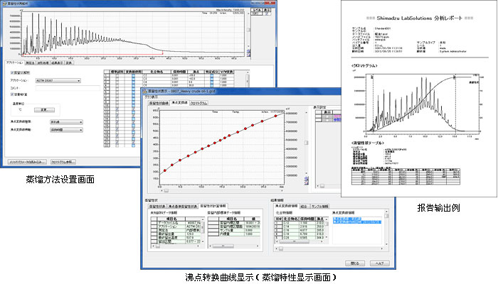 蒸餾GC解析軟件的各功能顯示在色譜數(shù)據(jù)處理系統(tǒng)Labsolutions的菜單上,可以實(shí)施從校正到樣品分析的一系列分析。報(bào)告具備各種蒸餾GC規(guī)格所需的計(jì)算功能,色譜圖輸出對(duì)應(yīng)蒸餾特性曲線、參照油分析等的色譜圖重繪。可以自由地自定義報(bào)告中的項(xiàng)目配置,靈活制作報(bào)告書。具備各種物性信息的計(jì)算功能、多數(shù)據(jù)的匯總報(bào)告制作等充實(shí)的再解析功能。
